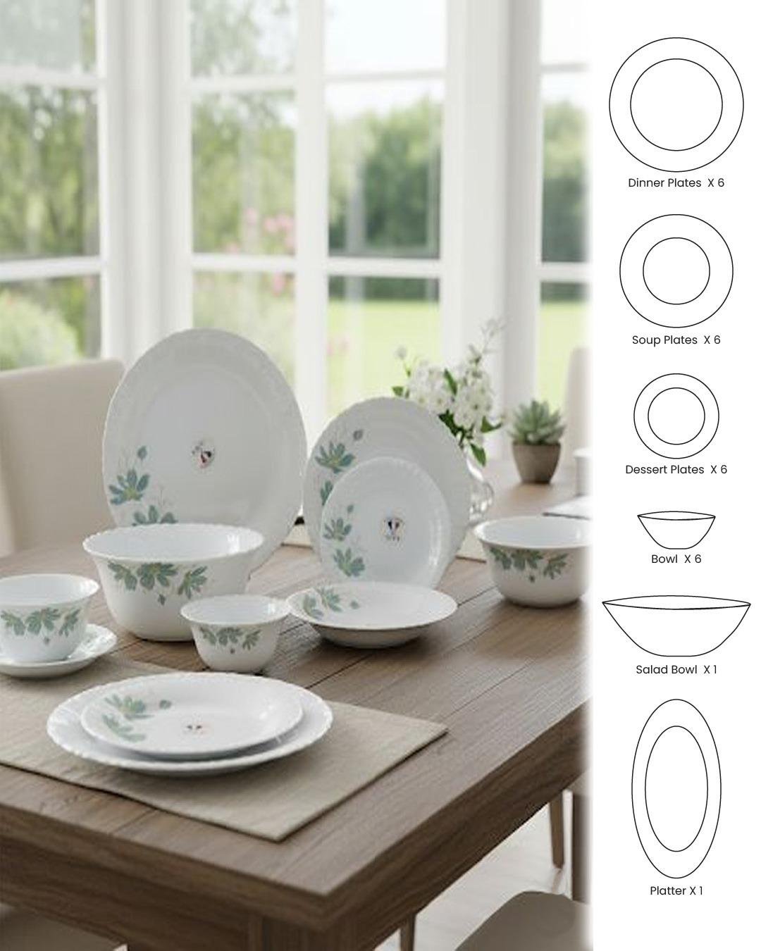 26 piece floral dinnerware set, white opal tableware set, elegant dinner set for 6 persons, floral opalware crockery, stylish dinnerware collection, opal dinner set microwave safe.