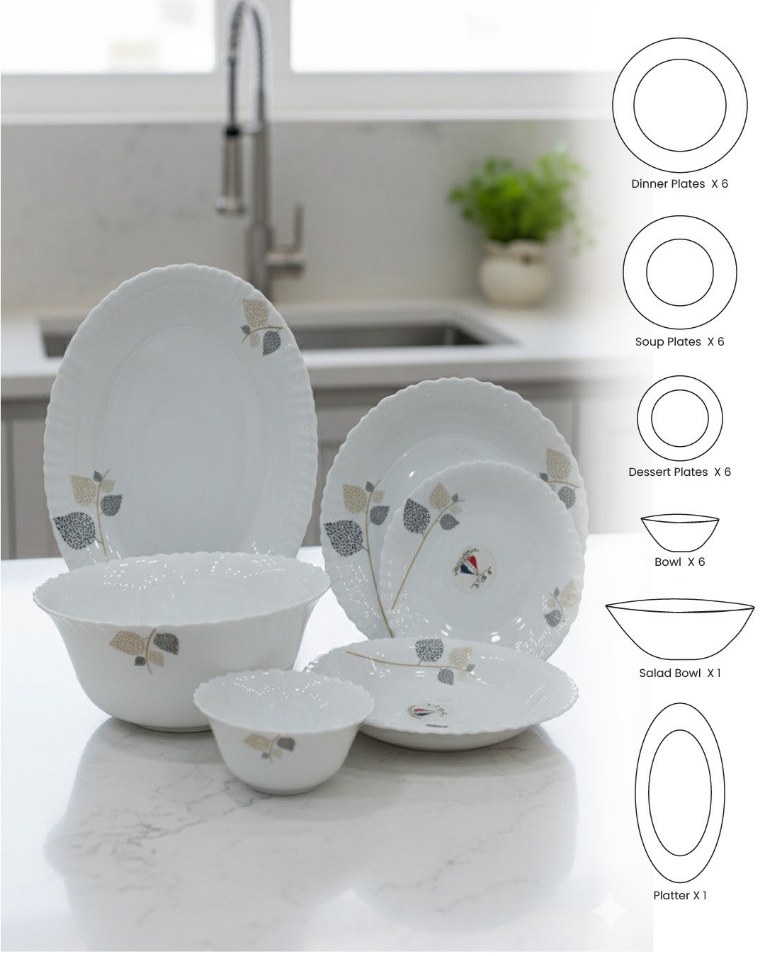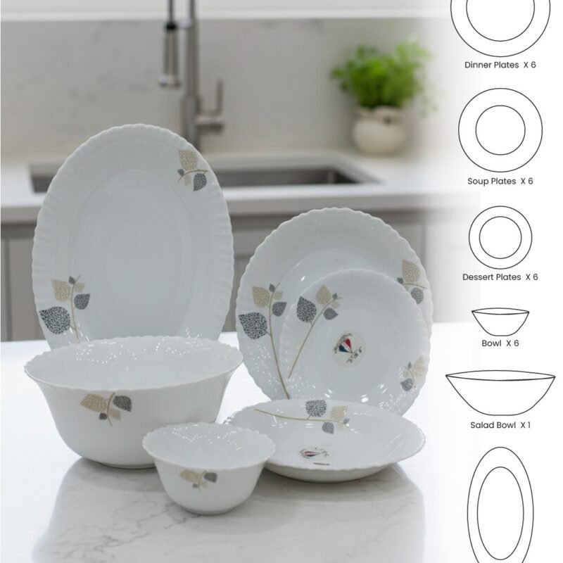 Bring elegance and durability to your dining with the 26-Piece Opalware Dinner Set. Featuring a refined leaf design on premium white opalware, this set is lightweight, chip-resistant, and safe for microwave and dishwasher use. Perfect for serving 6 persons with style.
