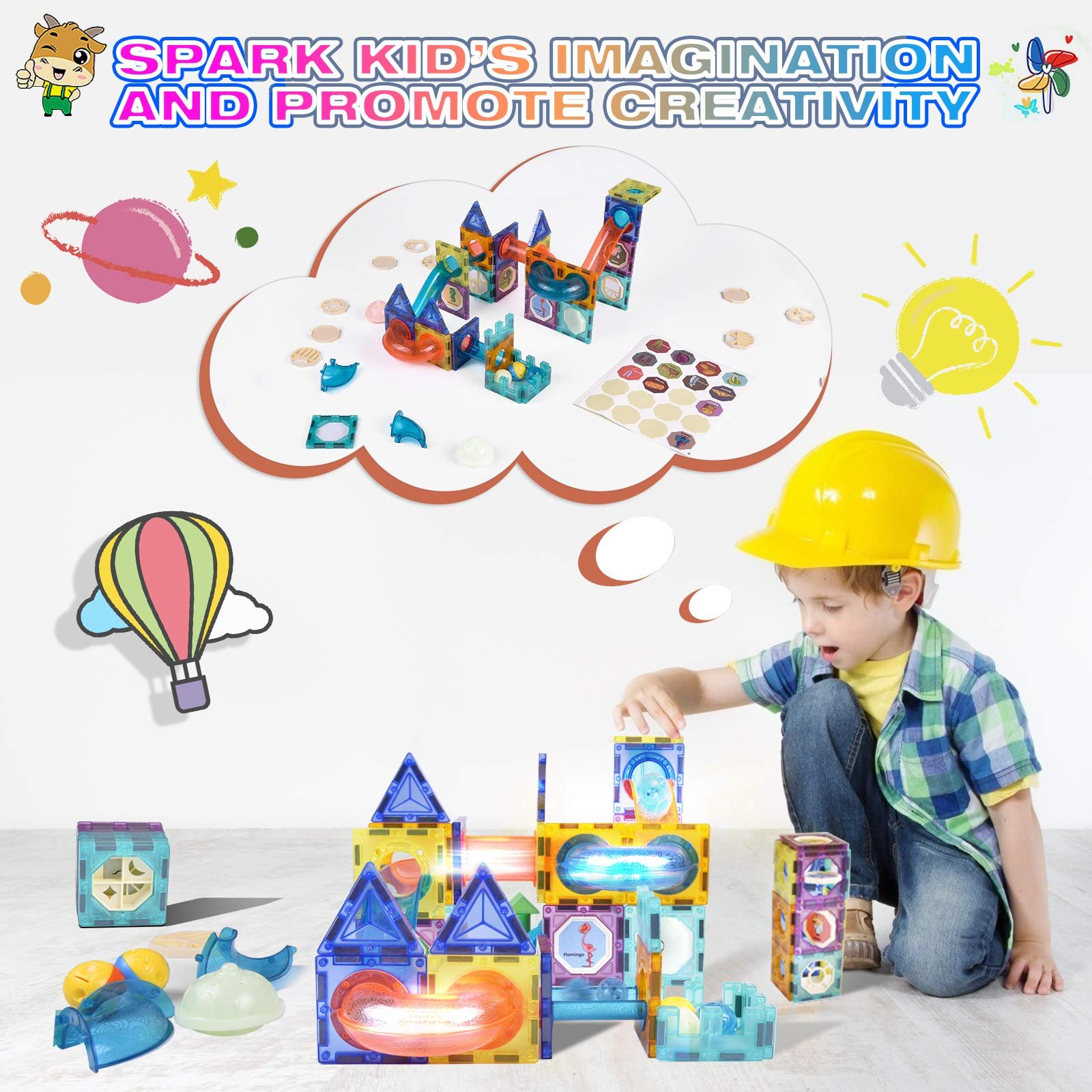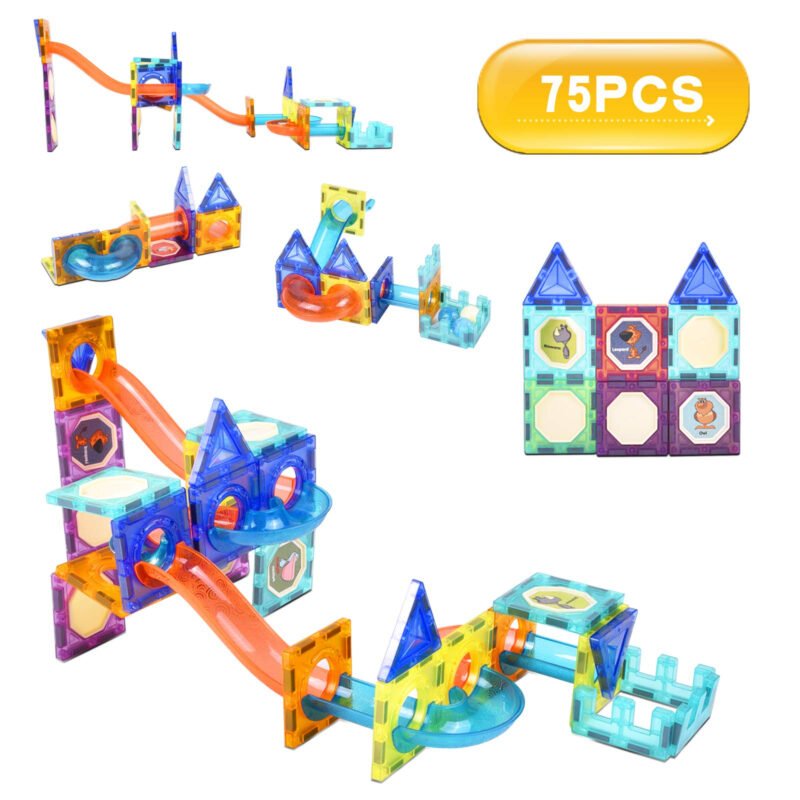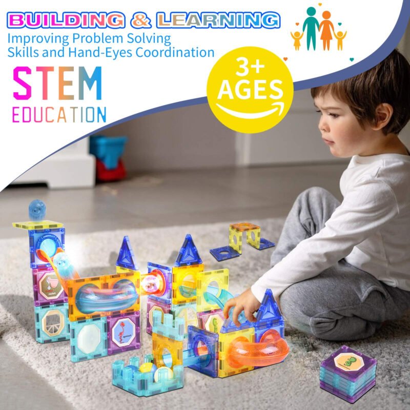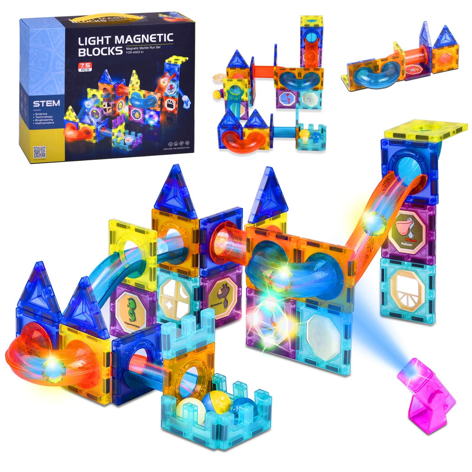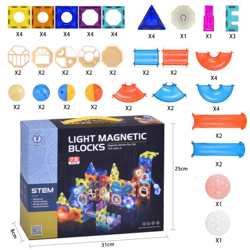 75pcs Magnetic Building Set – Includes tiles, marbles & LED lights.