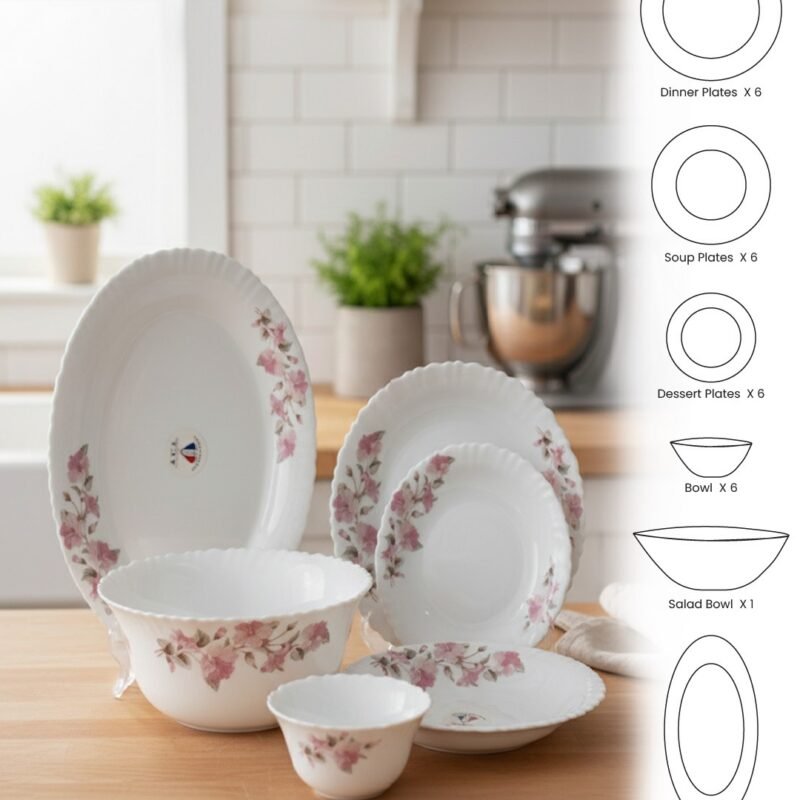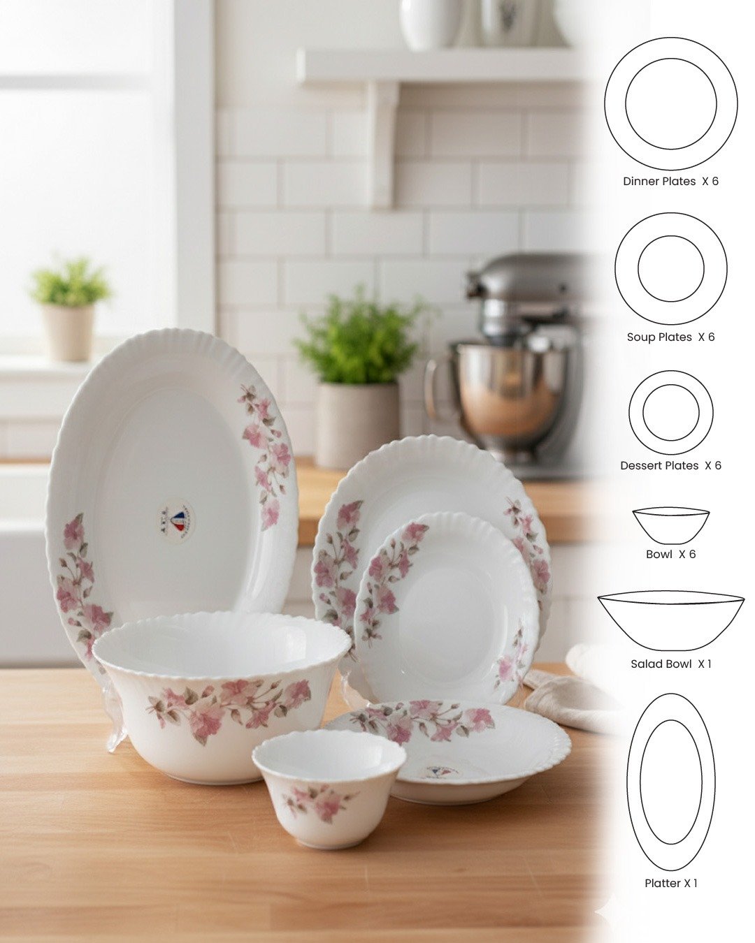 The Blossom Charm 26-Piece Opalware Dinner Set brings timeless elegance to every meal. Featuring delicate floral designs on durable opalware, this lightweight, chip-resistant dinnerware set is perfect for serving 6 persons—ideal for daily dining, family gatherings, and festive occasions