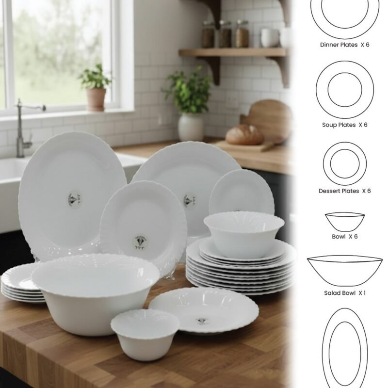 Add timeless elegance to your dining table with this 26-Piece White Opal Dinnerware Set. Designed to serve 6 persons, this premium opal collection includes plates, bowls, and serving essentials. Lightweight, chip-resistant, and microwave & dishwasher safe—perfect for both daily use and special gatherings.
