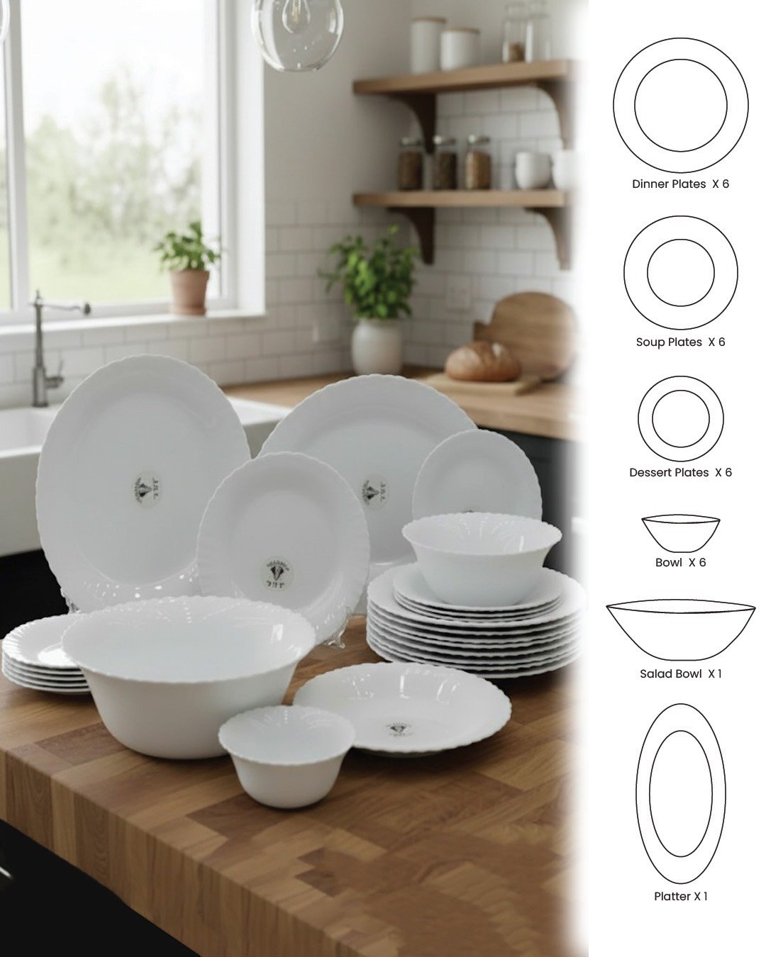 Complete 26-Piece Collection – Includes dinner plates, quarter plates, soup bowls, dessert bowls, and serving bowls.