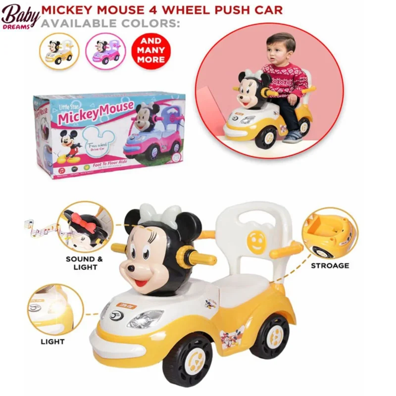 The Little Star Mickey Mouse Push Car BD-F065 is a fun and safe 4-wheels ride-on push car for kids, designed with a cute Mickey Mouse theme. Built with a sturdy frame, comfortable seat, and smooth wheels, it provides toddlers with endless fun while helping them develop motor skills and coordination. Perfect for indoor and outdoor play, this push car is an exciting toy and a wonderful gift for little ones.