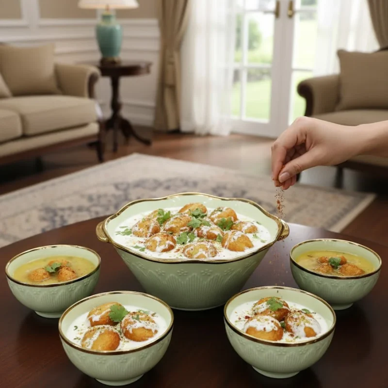Elegant 15-piece ceramic soup set with gold trim in 6 vibrant colors. Includes serving bowls and spoons for luxurious dining.