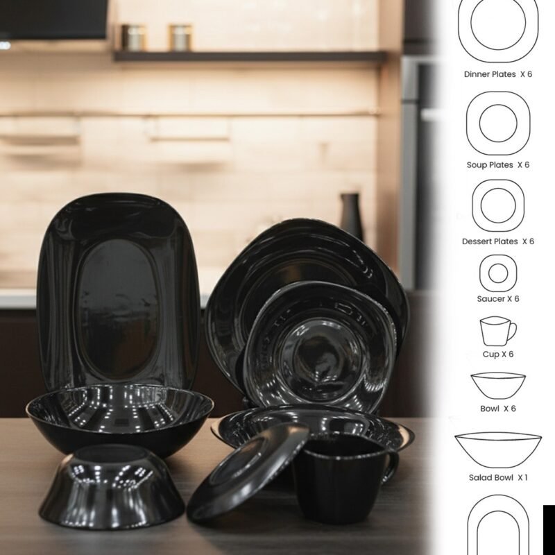 Luxury black dinnerware set, Modern black dinner set, Elegant black tableware, Stylish black dining set, Premium black dinnerware, Durable black plates and bowls, Contemporary black dinner set, Luxury dinner set for dining