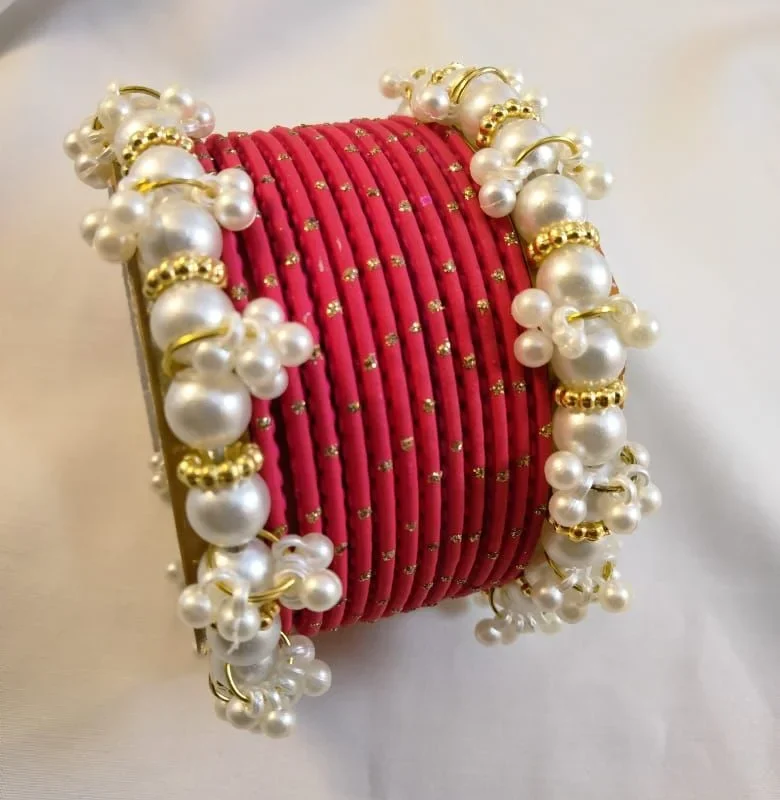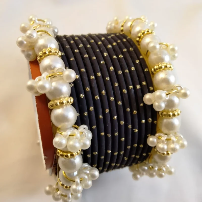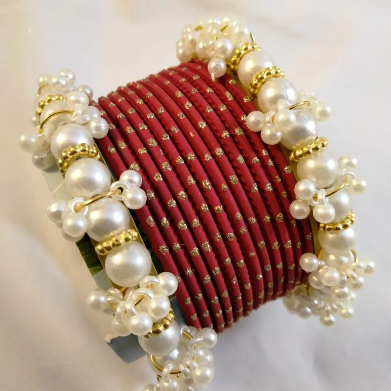 Add timeless elegance to your jewelry collection with this Metal Bangles Set with White Pearls Kangan, designed to offer a perfect blend of tradition and modern charm. Crafted from high-quality metal and decorated with lustrous white pearls, these bangles enhance any outfit with their graceful and sophisticated appeal. The smooth finish and comfortable fit make them ideal for daily wear, festive occasions, bridal functions, and cultural events. Pair them with ethnic, bridal, or casual outfits for an instantly polished and feminine look. This pearl-adorned bangle set also makes a thoughtful gift for women and girls who appreciate classic beauty.