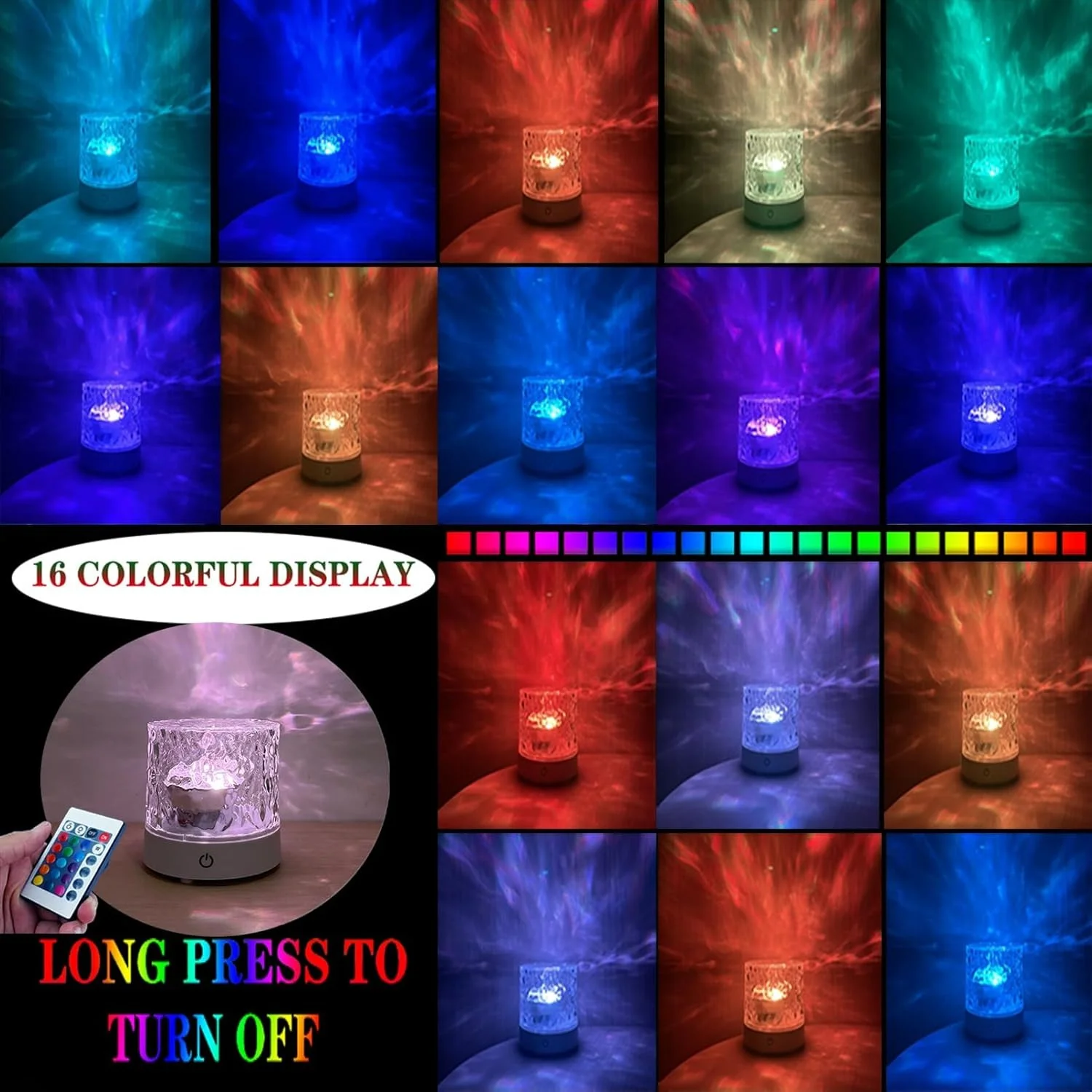 Create a magical atmosphere with the USB Dynamic Water Ripple Round Light. Featuring 16 color modes, crystal aurora effects, starry galaxy projection, and remote control, this rechargeable 3D night lamp is perfect for room décor, Christmas, parties, and events. Portable and stylish for home or gifting.